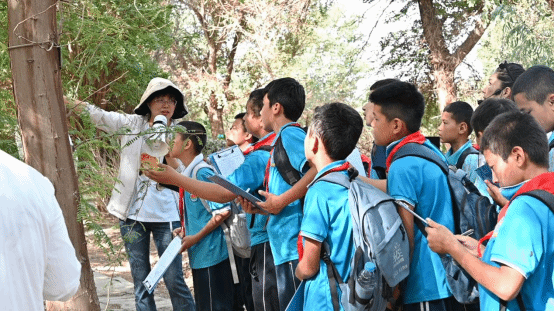 在活動中,通過調動五感,同學們在“荒漠探寶單”的指引下,近距離觀察和感受荒漠植物,深入理解植物在干旱酷熱的荒漠環境中展現出的獨特形態與生存策略之間的密切關系。