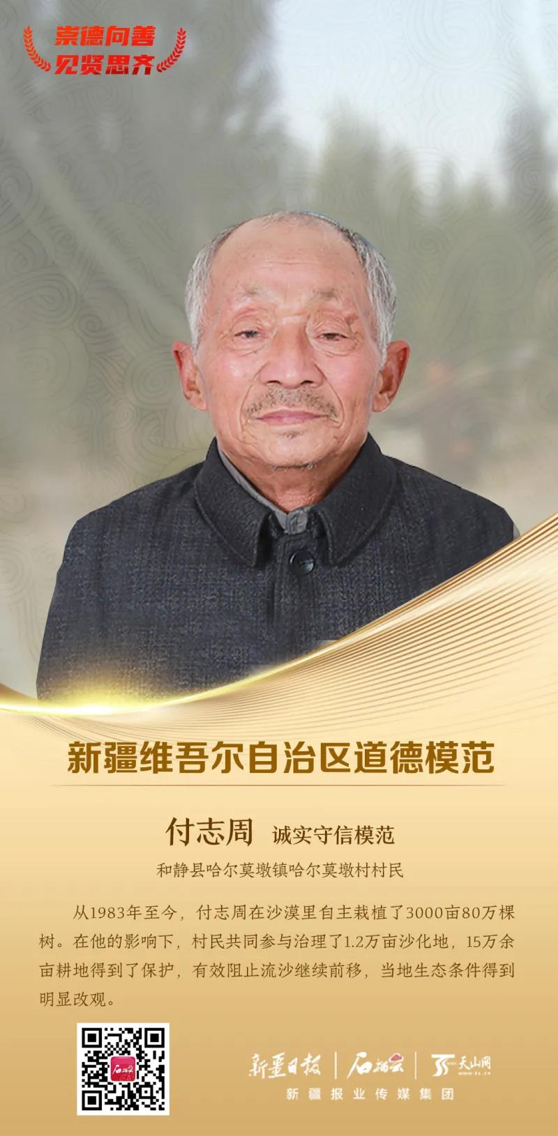 付志周是和靜縣哈爾莫墩鎮哈爾莫墩村村民,從1983年至今,他已在沙漠里種了3000畝80萬棵樹,曾經的荒漠變良田,辣椒、玉米等農作物連年豐收。