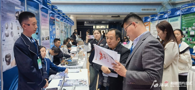 第38屆新疆青少年科技創(chuàng)新大賽比賽現(xiàn)場,評委和學生進行交流。石榴云/新疆日報記者 謝慧變攝