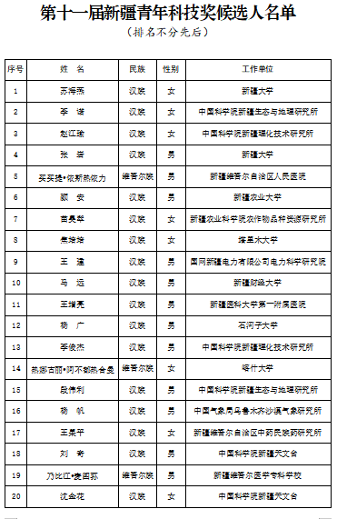 根據第十一屆新疆青年科技獎評選工作安排,自治區黨委組織部、科協、人社廳和團委共同組織開展了第十一屆新疆青年科技獎評選工作。經形式審核、初評、復評和終評,擬確定20名候選人為第十一屆新疆青年科技獎獲得者,現予以公示,公示期為2023年9月5日至11日。