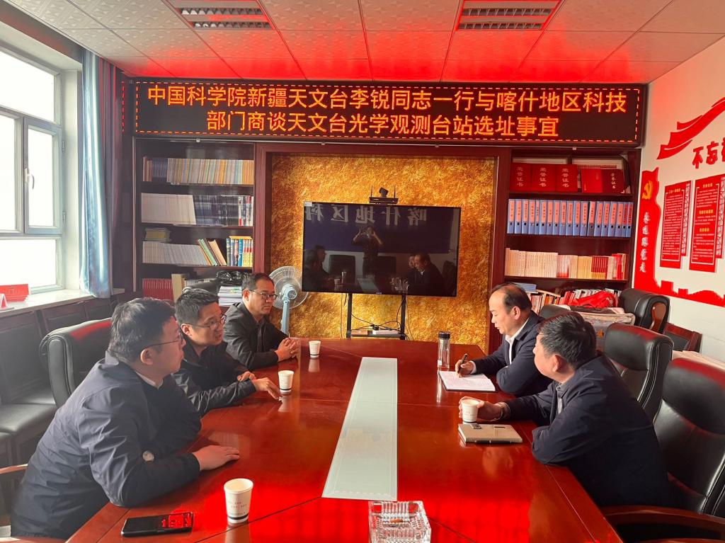 2023年3月28日,中國科學院新疆天文臺奇臺觀測站站長李銳高級工程師、慕士塔格觀測站副站長許競高級工程師、喀什觀測站辦公室主任朱德軍一行來到喀什地區科學技術協會,與地區科協黨組書記、副主席王天雨、地區科技局黨組書記王立軍就加強雙方在天文領域科技科普合作等內容進行了會談。